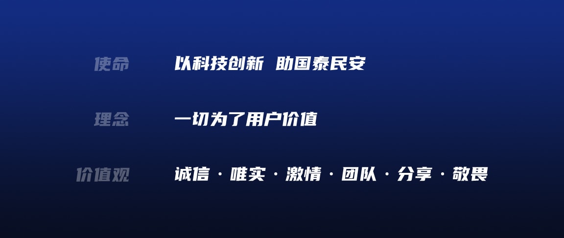 未來(lái),我們将持續踐行(xíng)“以科(kē)技(jì)創新、助國(guó)泰民(mín)安”的(de)神聖使命,為(wèi)公共安全事(shì)業(yè)和(hé)社會(huì♥)治理(lǐ)現(xiàn)代化(huà)貢獻力量!努力成為(wèi)公共安全領域值得(de)信賴并受人(rén)尊敬的(de)創新型高(gāo)科(kē)技(jì)企業(yè)!